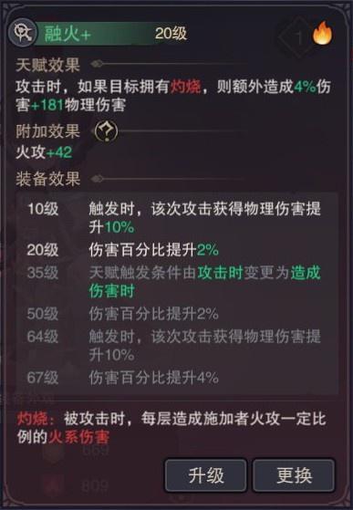 4.融火:造成伤害时可对带有灼烧效果的敌人额外造成伤害和本次攻击获得20%物理伤害加成(主要配合连击和流炎、燃火盔甲来使用)