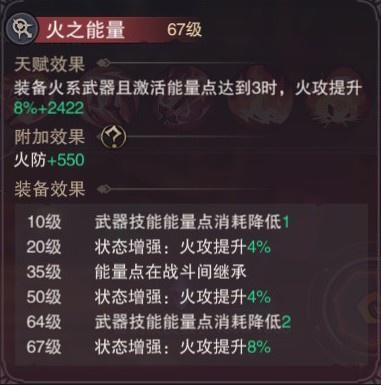 8.火之能量:武器大招消耗降低3点并在累积3点武器能量后火攻增加+24%,需要暖机但问题不大(说实话单看降能量消耗用处不大因为大招要冷却,武器大招是每击中一个带有灼烧的目标火攻+20%持续3回合,所以配合回收的使用技能可以降低冷却2回合后却让此天赋变得强势起来)