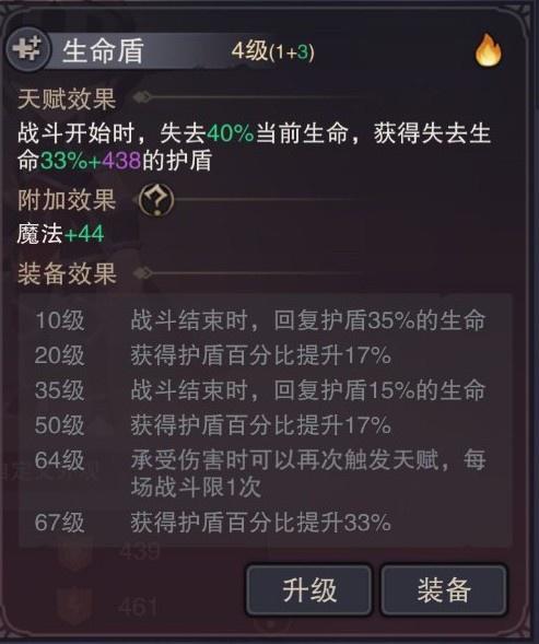 12.生命盾:满级时战斗开始失去40%当前生命值并获得失去生命值100%的护盾值,受伤时可再次触发一次该天赋效果,战斗结束时回复50%护盾值的生命(主要开局压低自身血线配合本能和自愈使用,打世界首领可以换成吸血或者聚能护盾也可以换成盾噬)