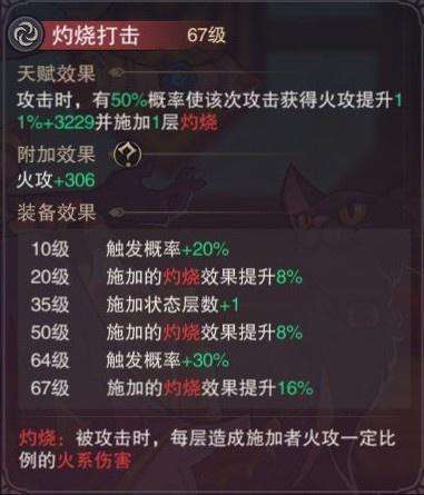 7.灼烧打击:攻击时给敌人挂一层灼烧并增加本次攻击伤害,还增加灼烧效果(满级灼烧效果+32%)