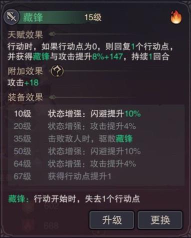 6.藏锋:行动时,行动点为0则回复两点行动点,并获得藏锋亮锋和闪避+20%一回合,击败敌人可清除藏锋状态(亮锋:增加攻击力,藏锋:下回合减少一点行动点)
