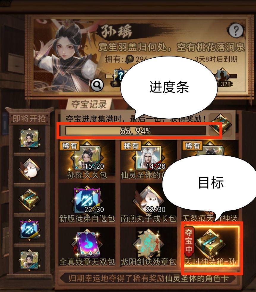 1.自动进度条:卡池每分钟自动跳1.83的进度,自动进度在大于97.8后会停止自动进度,所以在蹲包的时候可以适当的垫一垫让自动进度最后一跳可以使进度条超过99这样可以省很多小侠客,资源不多的情况下最好别拿第一轮的包,因为第一轮抢的人较多。