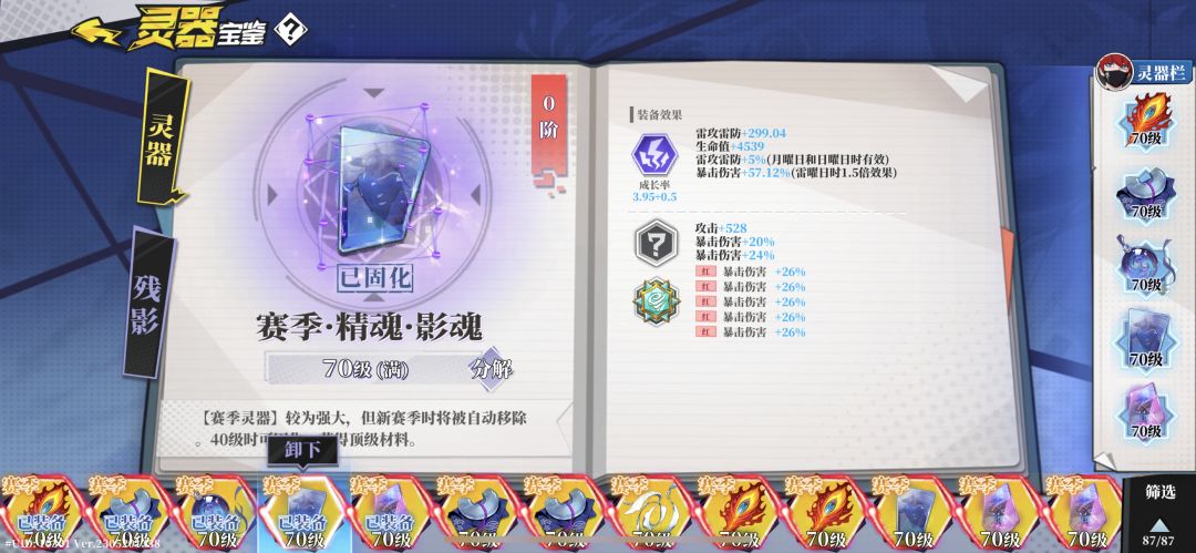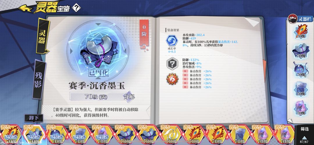 墨玉:满级有142.8的爆伤加成,解封2,百分百触发。主要灵器之一