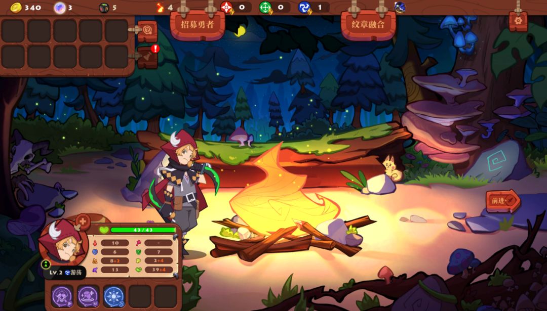 旅途中的篝火象征着休息。您可以在此处回复生命,同时能够招募其他勇士一同冒险,亦或者融合文章强化自身。