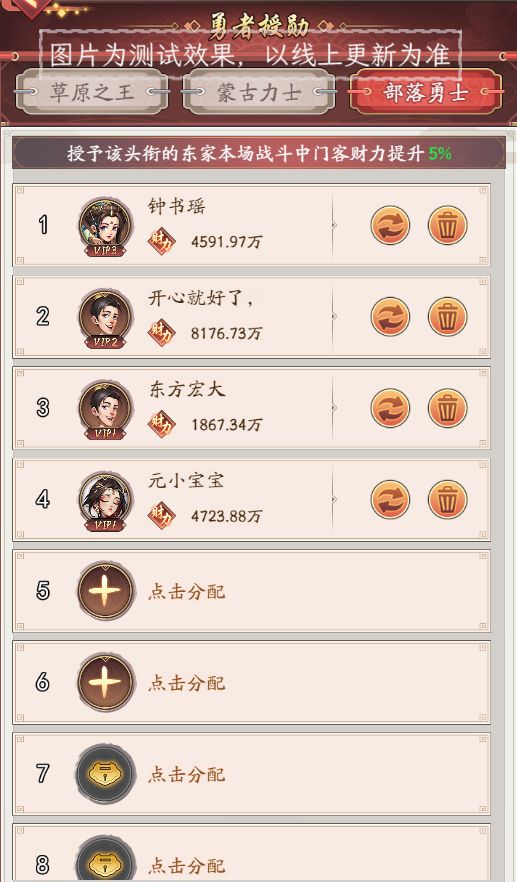 取消原有职位加成效果,新增勇者授勋功能,族长和长老在每轮的积分赛开始前可以对家族成员进行授勋,