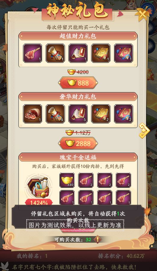 停留在瑰宝礼包未购买时,自动获得1次该礼包的购买次数,让洛阳跳的更流畅。