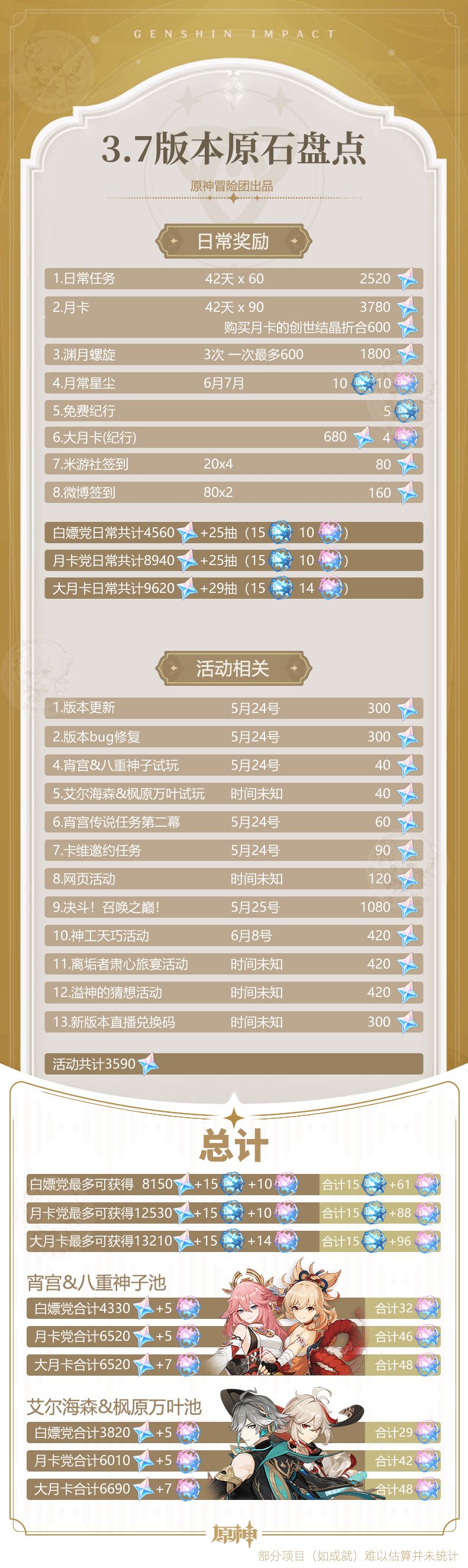 3.7版本终于要更新了,我们根据已有的信息对3.7版本获得的原石数量进行了计算,每部分还有详细依据,方便大家心中有数。