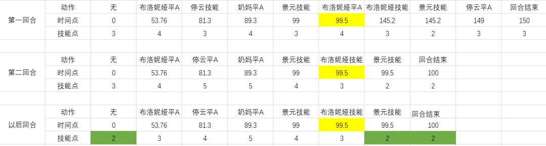 着重讲如何实现最后一点,在不加速不拉条的情况下,目前唯一实现方法就是布洛妮娅的再动,要满足的条件就是布洛妮娅在主c之后有一次行动机会。实现的方式有两种,第一布洛妮娅速度低于主C,第二布洛妮娅第二次行动在主C之后。本次采用第二种方法。