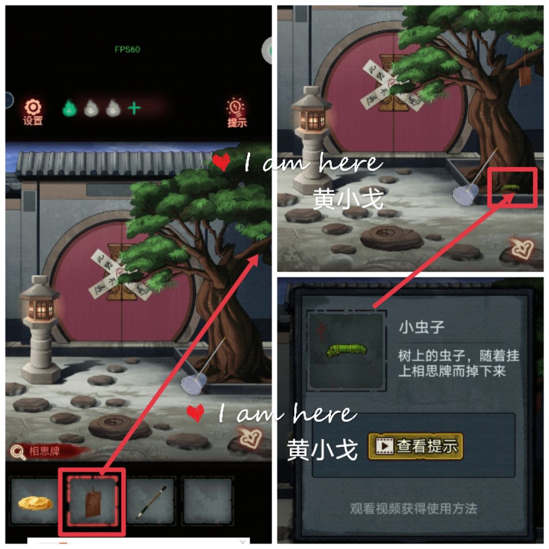 15.(院子-左边场景)把【相思牌】挂到树上,虫子掉下来,获得【小虫子】