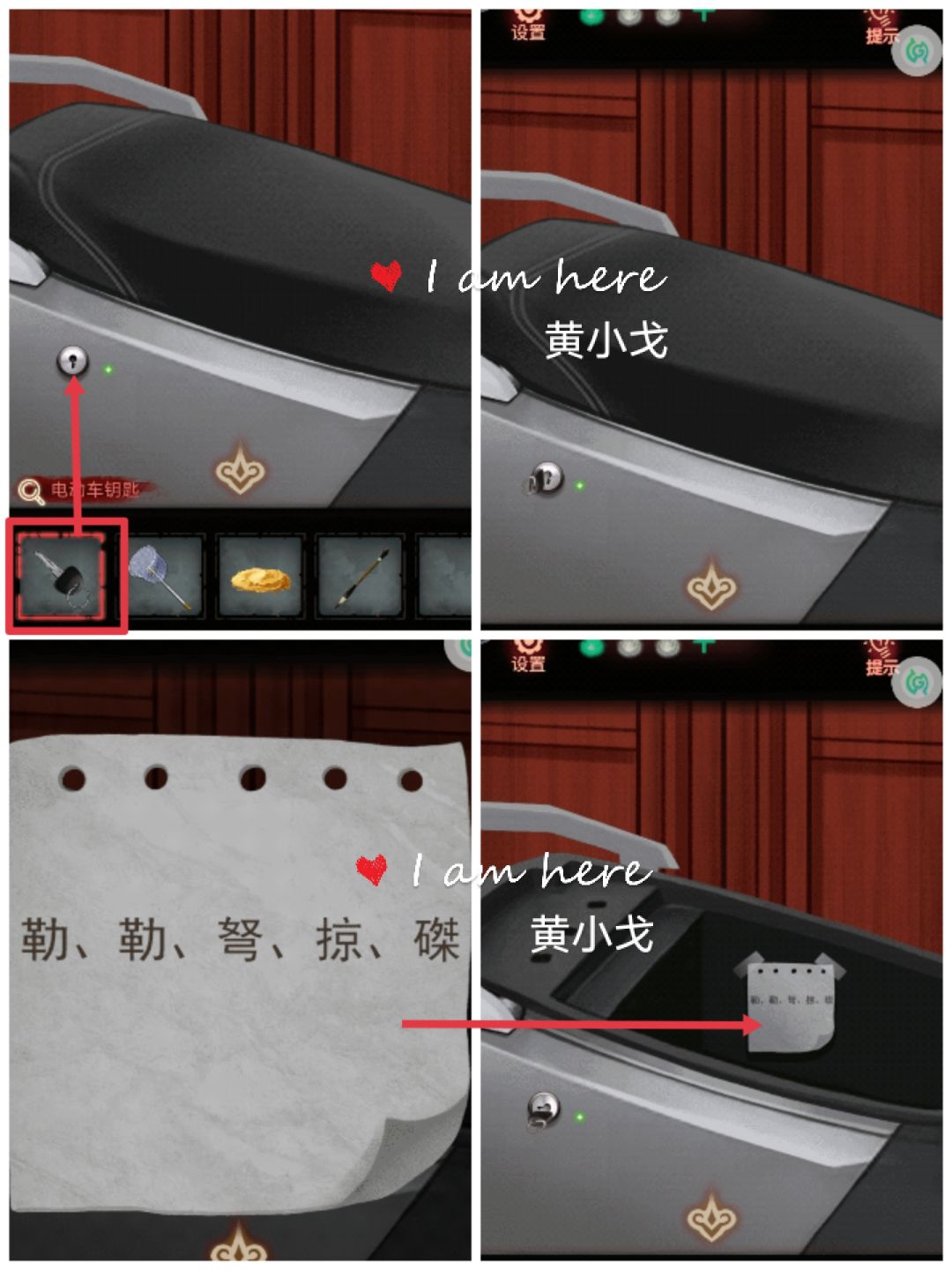 11.(房间2-左边场景)点击左侧书桌,用【毛笔】写字,获得线索:未(先拿到电动车里面的线索)