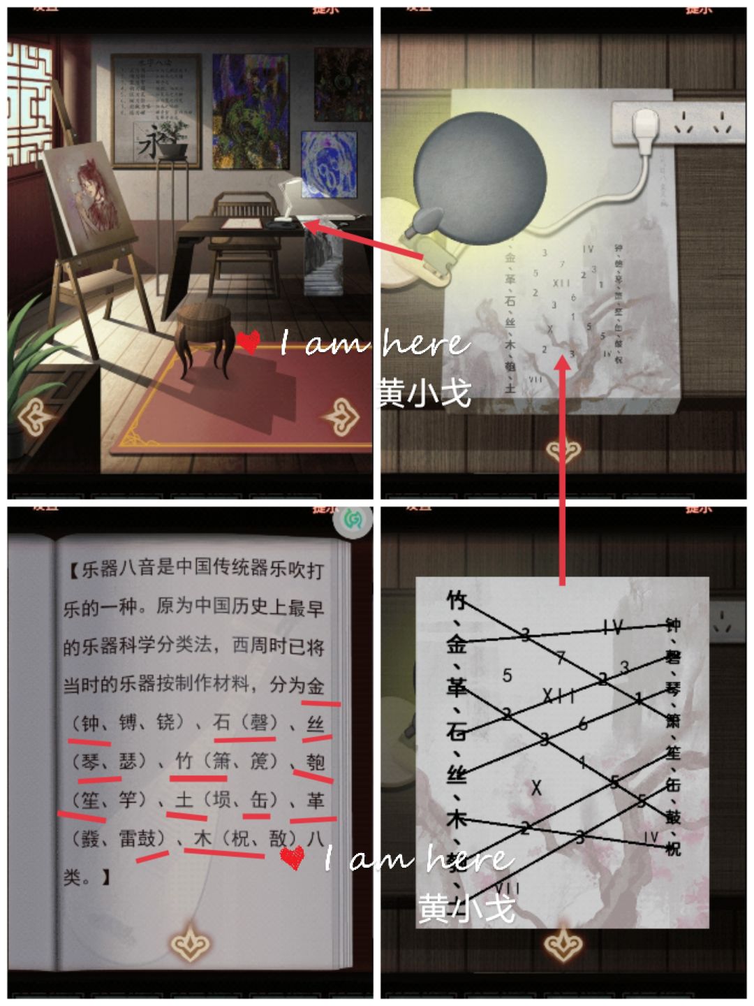 2.点击右侧书桌,点击画,根据《论古代乐器》的内容用【毛笔】连线,获得线索(连线交点从上到下:321235523)