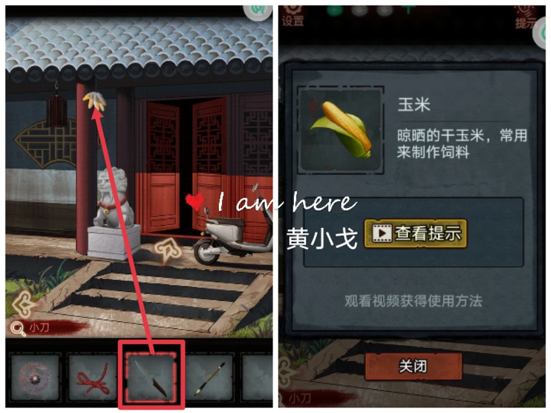 7.(院子-右边场景)用【小刀】割挂在房梁上的【玉米】