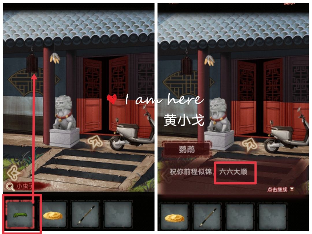 18.(院子-右边场景)拿【小虫子】喂鹦鹉,获得线索:六六大顺