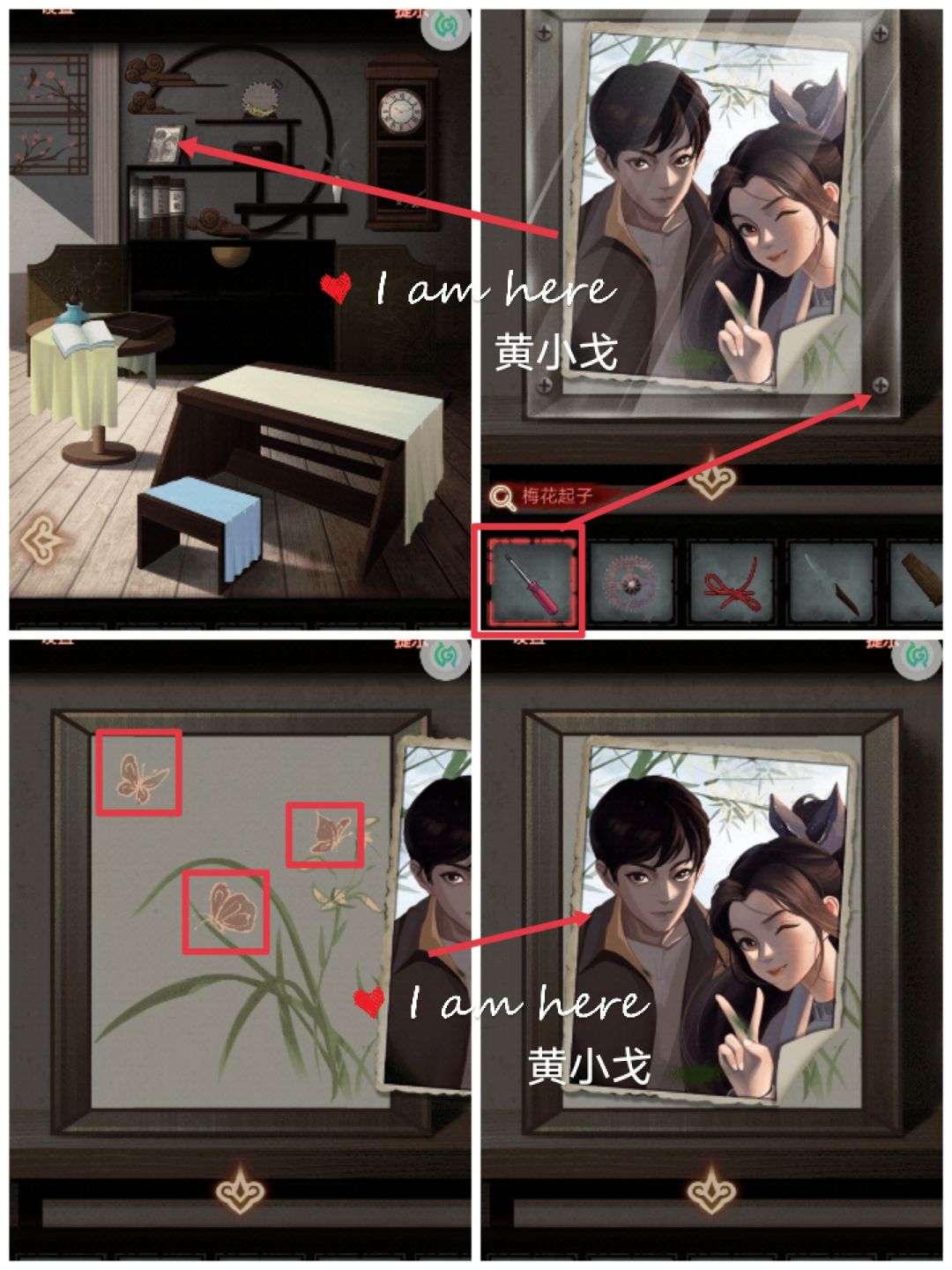 3.(房间2-右边场景)点击架子上的照片,用【梅花起子】弄掉螺丝,拿走照片,在相框上获得线索(蝴蝶兰-三只蝴蝶🦋)