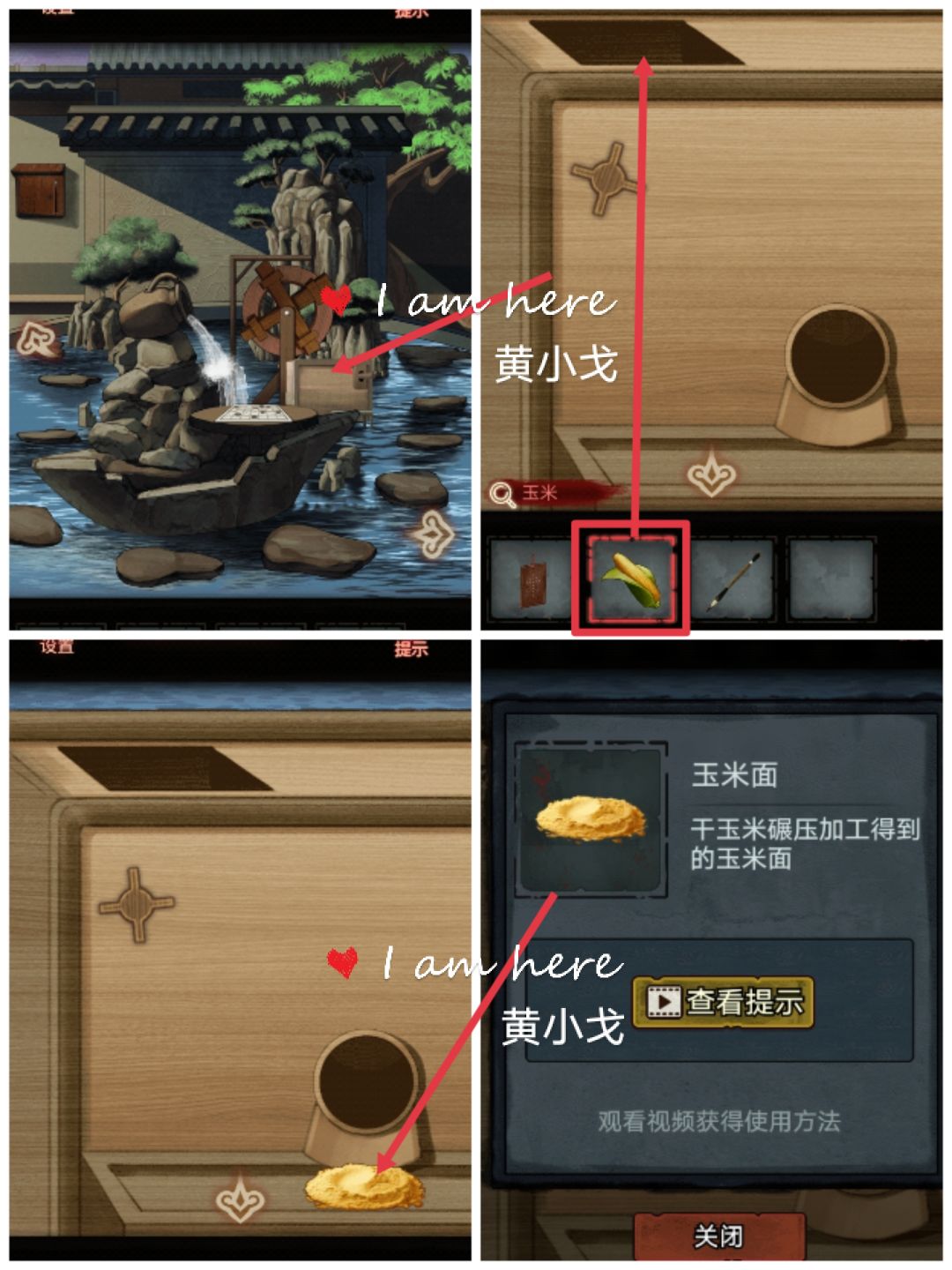 17.(院子-中间场景)点击墙壁,用【玉米面】喂锦鲤(一定要扔石头旁边),用【渔网】捞【白色勾玉】