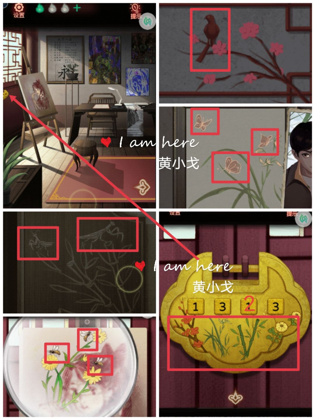 6.(房间2-左边场景)点击门上的锁,根据锁上的花,结合相框、画板、柜壁和墙上的装饰上花的种类和动物的数量,输入密码:1323,打开门