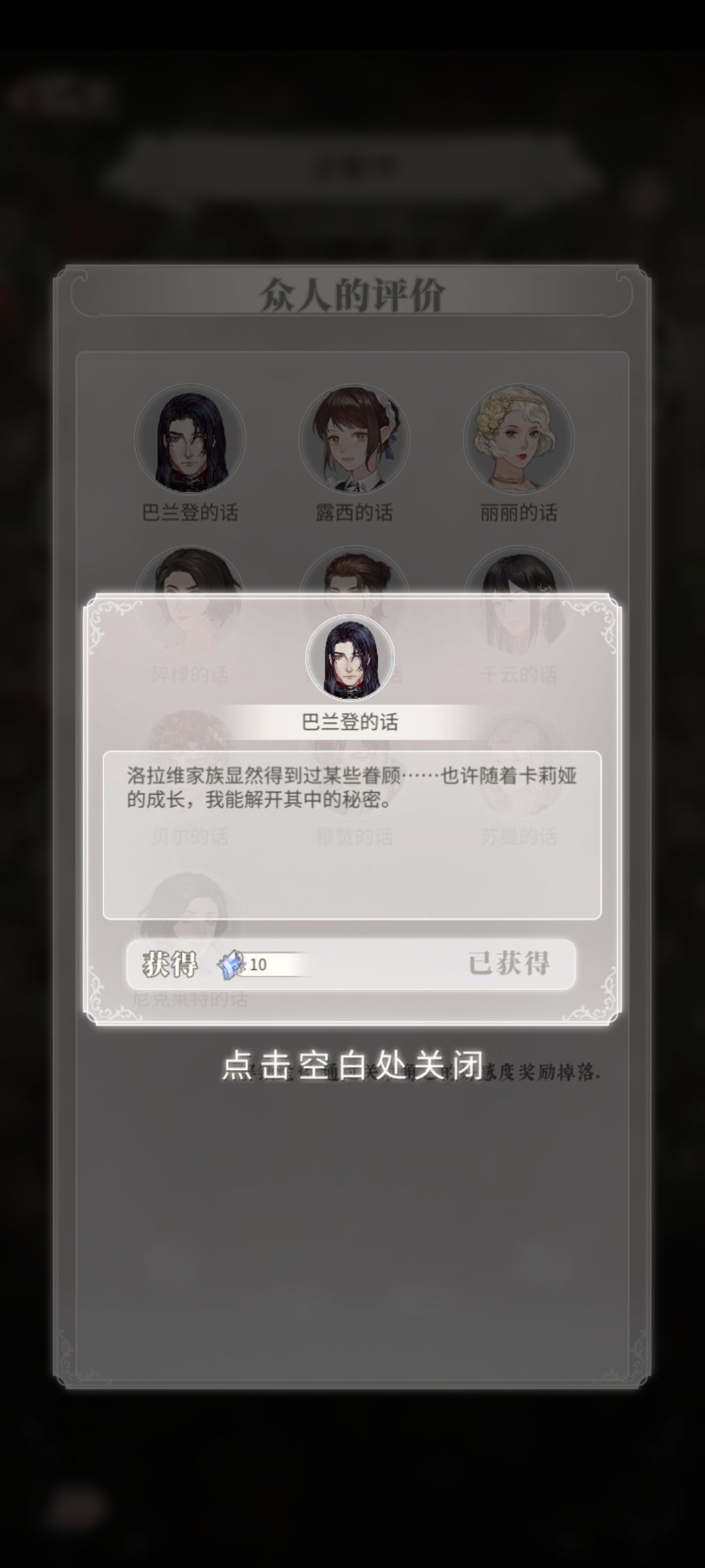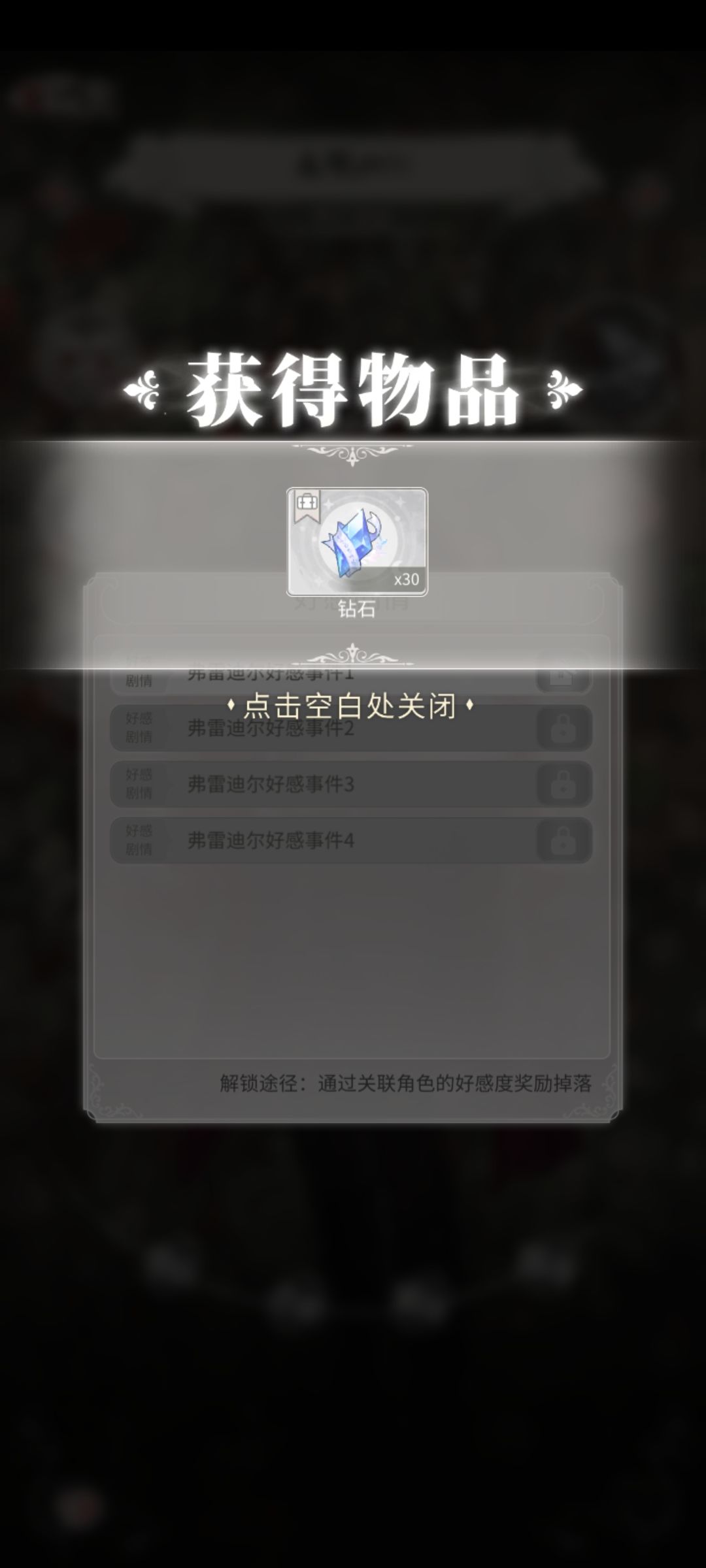 ⑧角色处,每条角色评价能领10钻,每个人物好感事件能领30钻
