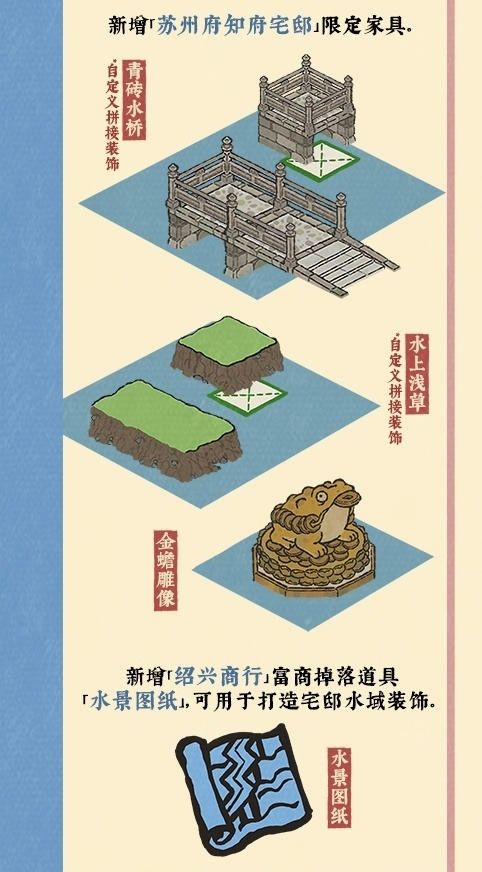 苏州宅邸额外增加水域装饰如【青砖水桥】,打造需要【水景图纸】——绍兴商行接待富商才能获得。我就知道绍兴商行会出个什么图纸的!只可惜目前预告的水域装饰实在是不敢恭维,休想哄人去浪费时间和心情搞商行!