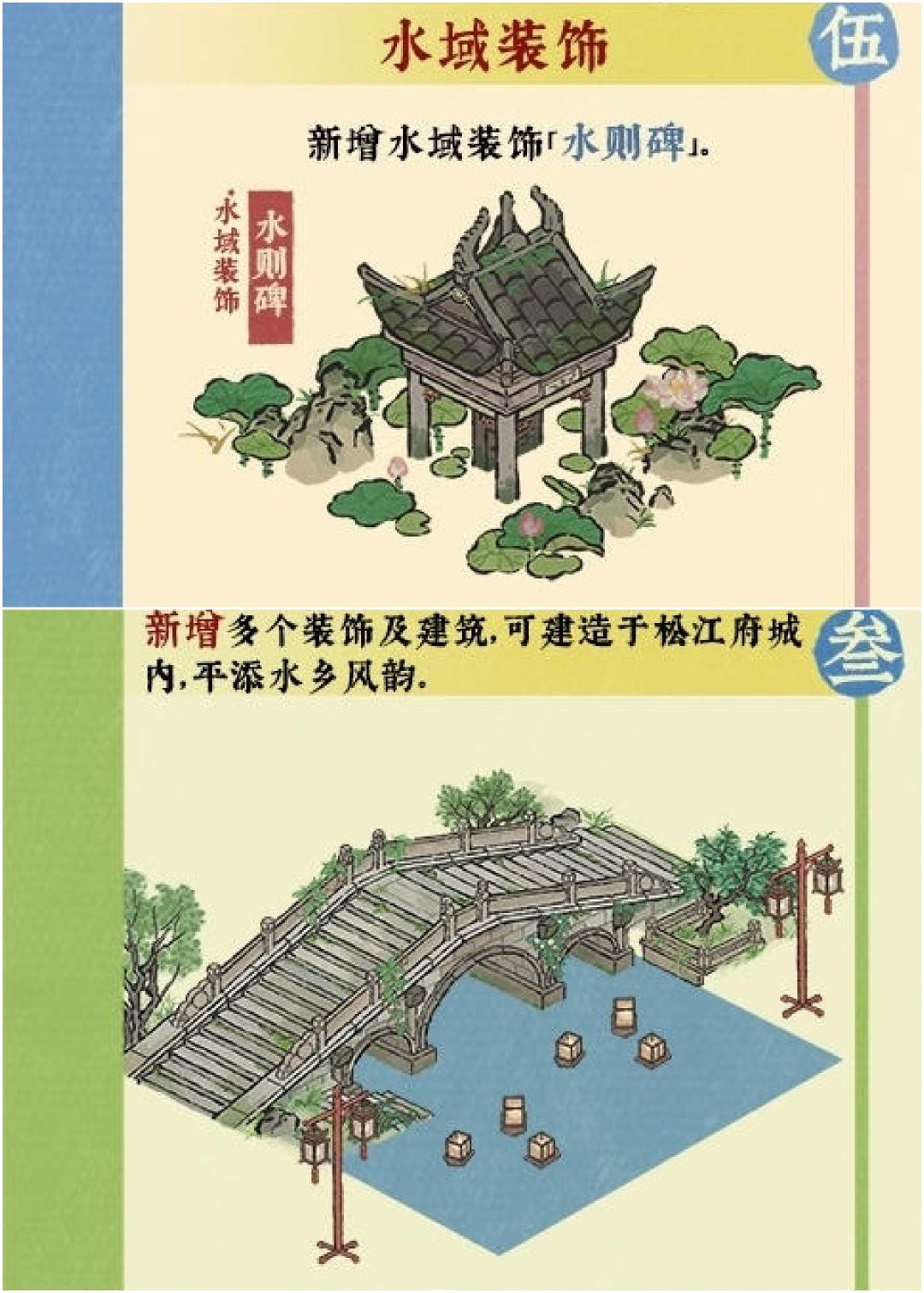 水域装饰新增【水则碑】,即将扩建的松江府额外增加路灯和河灯等装饰。