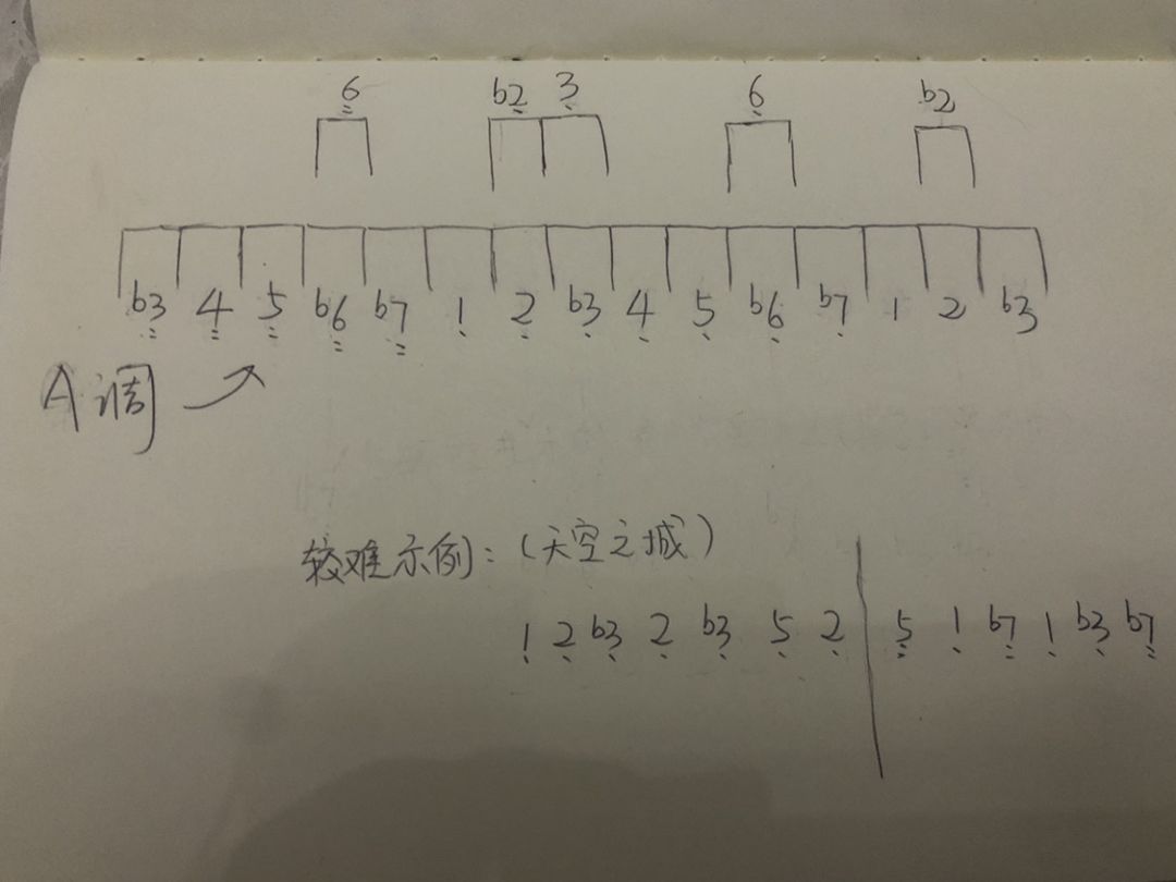 A调来了,这个有些难度,大家最好也像我这样画下来然后去编钟尝试,如果你本身学音乐的当我没说,示例曲子我想了半天就想起这个啦!这个曲子算是可以很好体现A调的重要性了