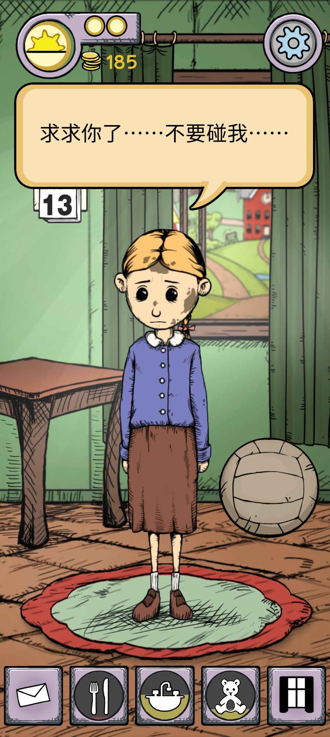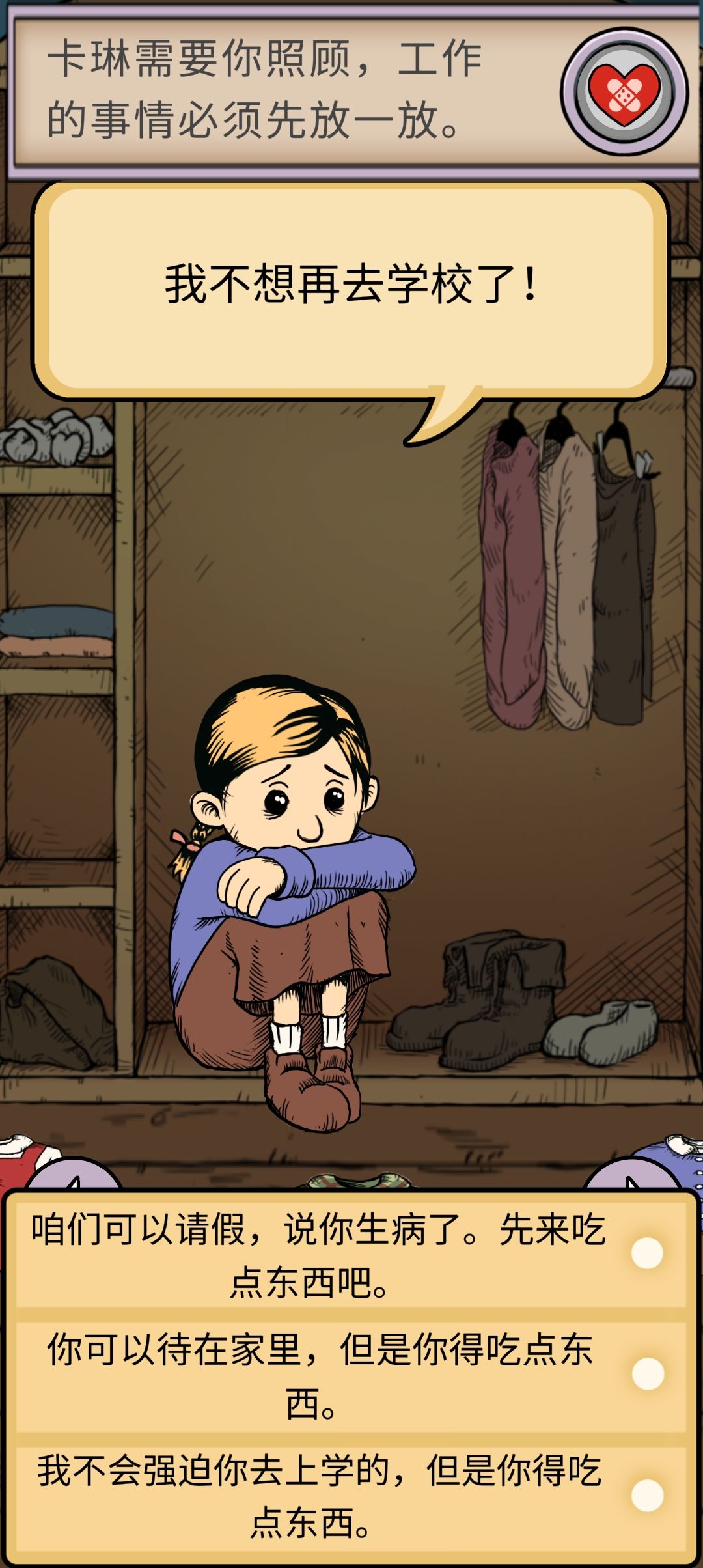 我这两天把这个游戏玩完了...不知道怎么说,我不会再玩第二遍了呜呜呜真的难受死了....原来养一个小孩子是如此的困难...我也没有能力把伤害她的人全部莎掉,我所能做的就是让她吃饱穿暖,每天能比昨天更开心一点点,在她需要我的时候待在家里...要哭死了,唯一后悔的就是在和她的外婆外公聊天的时候我忍耐了,没有起争执。如果是我真实的想法的话,我可能会拿刀了(微笑)
