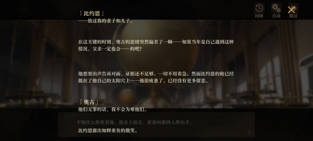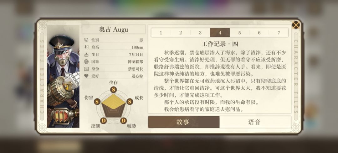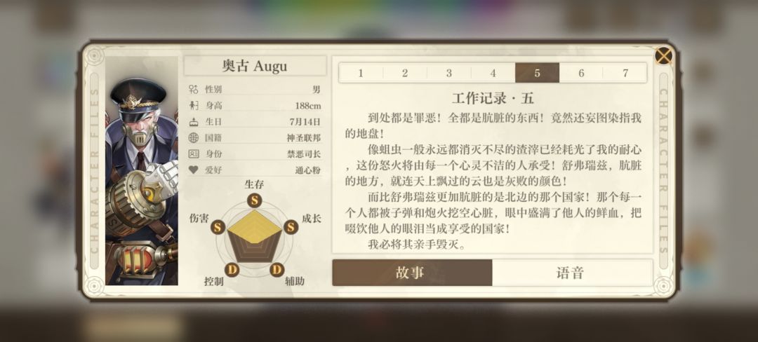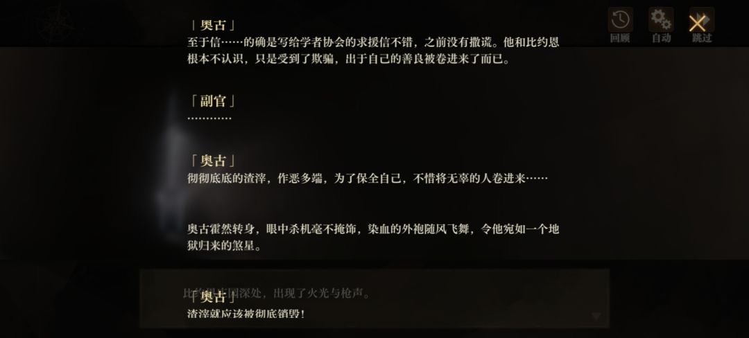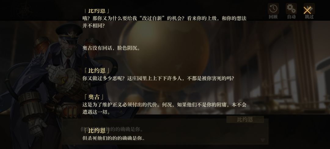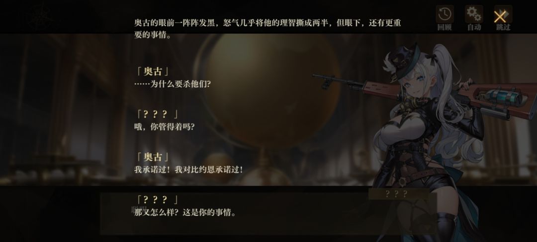 在银喉默契剧情一,奥古受命抓捕从事“违规研究”的学者比约恩。在银喉的操作下他和比约恩的矛盾被激化,但他在发现不对劲后对比约恩的态度明显软化,也没打算把事情做绝。