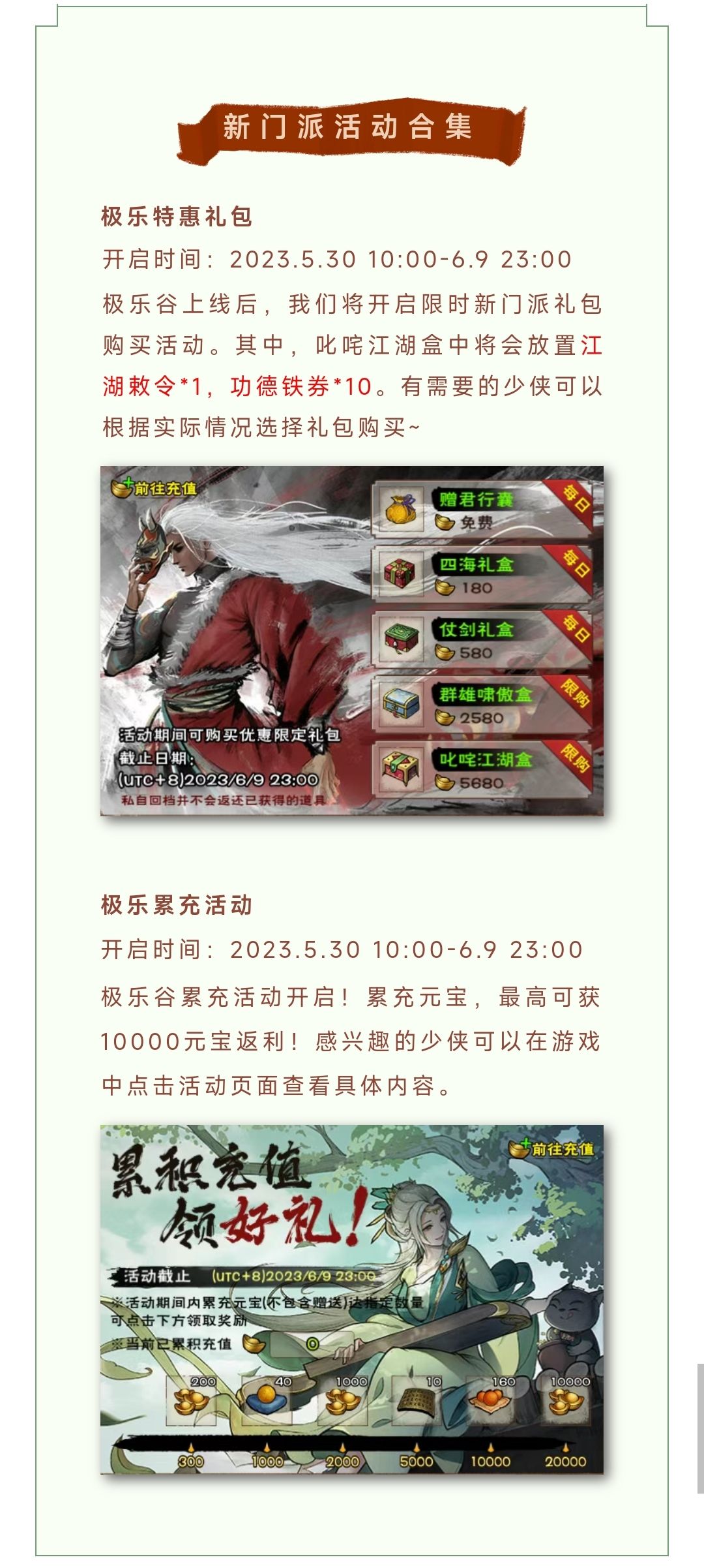 这次累充活动:官方还贴心给大家在5680礼包中加了10个功德铁卷(江湖特赦令只是缩短判门冷却时间90天,意义不大)新出的门派不需要这个 ,而且极乐谷是个只能深嫖的门派(不能嫖完判门,一轮下来起码3个多月,究极土豪也得一个半月,究极土豪+屯屯鼠大概一个月)