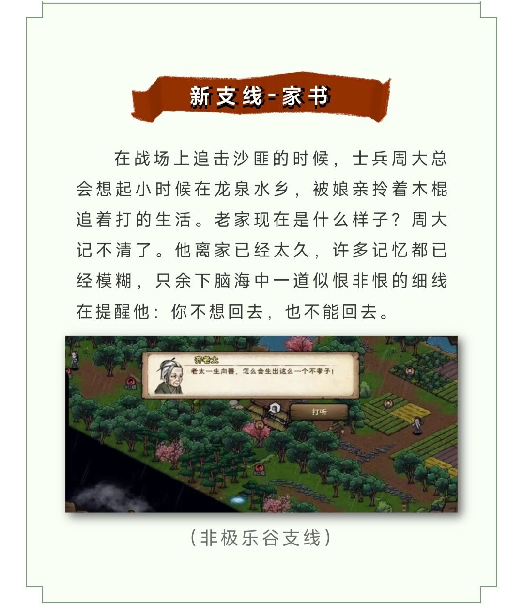 一看上去就是“强行安利悲剧”,没有啥新意。烟雨江湖大多的支线都是悲剧结尾,有人觉得“活着”就算是好结局。那这个标准可太低了。(这就是烟雨江湖世界观的标准)