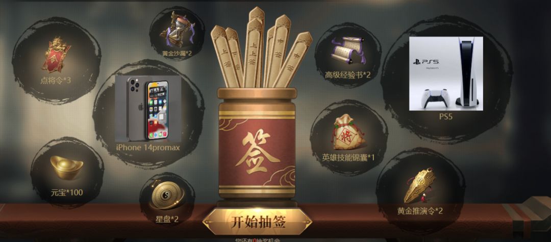 除了点将令,元宝等稀有道具,更有机会获得iPhone 14promax和PS5等实物大奖!