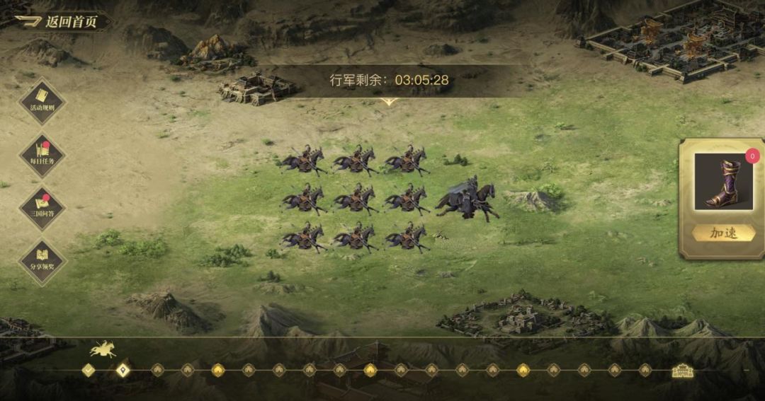 完成每日任务、每日首次攻陷城池以及参与三国问题,都将有机会获得行军加速机会。