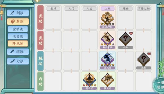 以上系统推荐降龙掌在主线出燕子坞之前非常爽,基本没有什么机制怪限制输出,直接一路平A了事,但是出燕子坞后,由于大量机制怪的出现(A三下眩晕,A三下魅惑,反伤盗贼),靠量大管饱的降龙掌显得稍微有点刮了,更别提星宿中为了凑三星而不得不每回合只A三下,感到乏力。