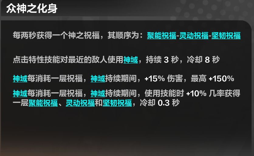 这里我就不一一展开截图了,大家进游戏自行了解。总之从后续解锁的新特性来看,我们在神域与祝福之外,新增了神域圈内外的区别以及对满血敌人造成额外伤害这一新机制,并与祝福层数挂钩。