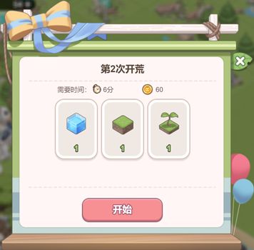 等级树达到3级时解锁开荒功能,开荒需要一名派遣动物,同时消耗一定数量的水元素、土元素、木元素以及金币,但有些荒地只需消耗金币。每次开荒只能选择与已解锁土地相连接的荒地,不同的荒地所需材料数量不同,随着开荒次数的增加,后期对材料数量的需求也会越大,若材料不足时也可以使用钻石购买。