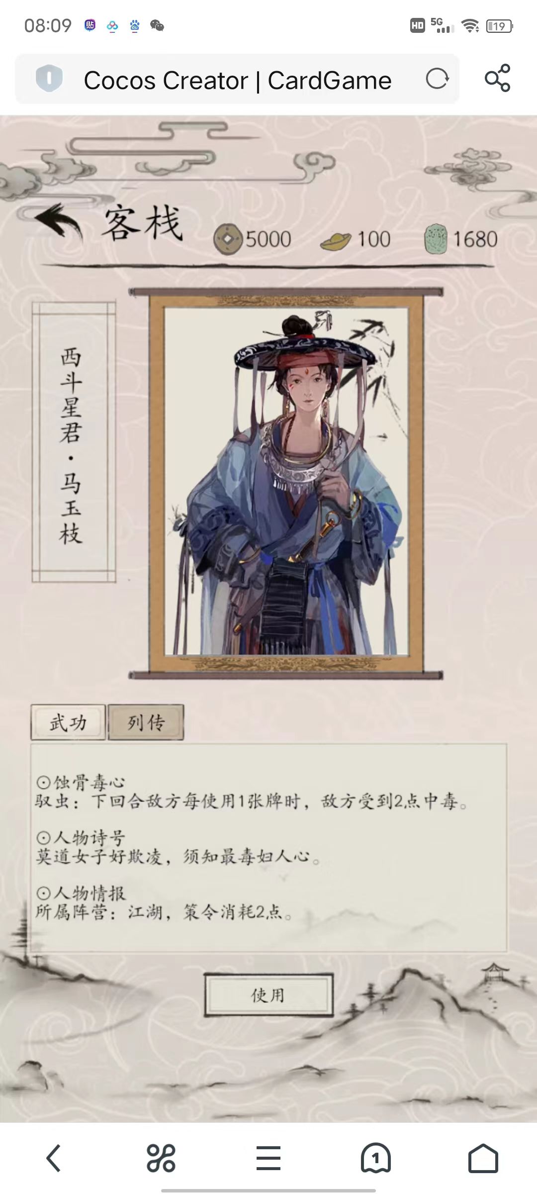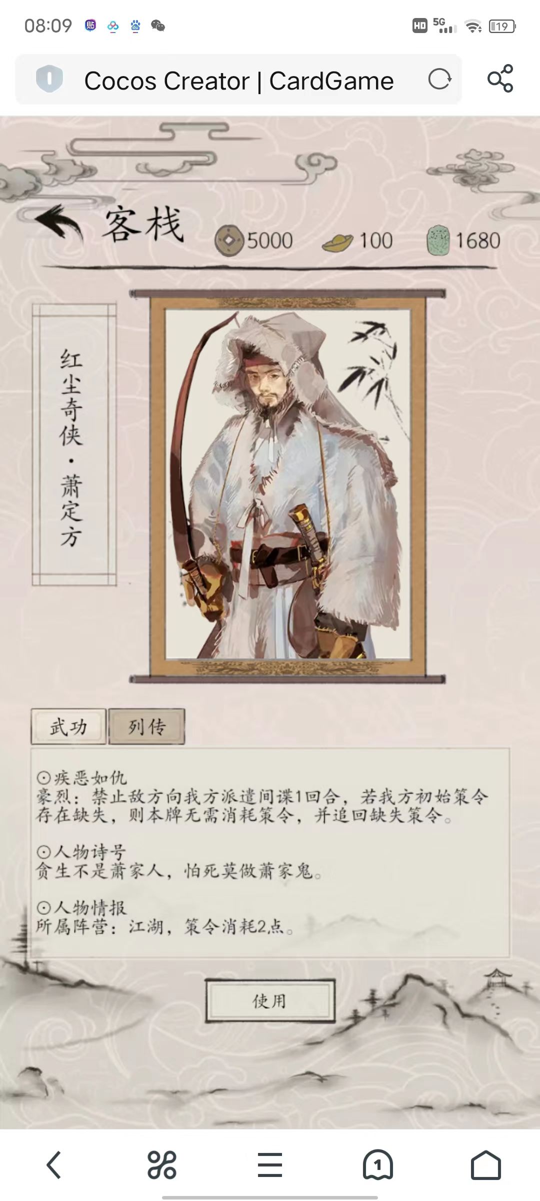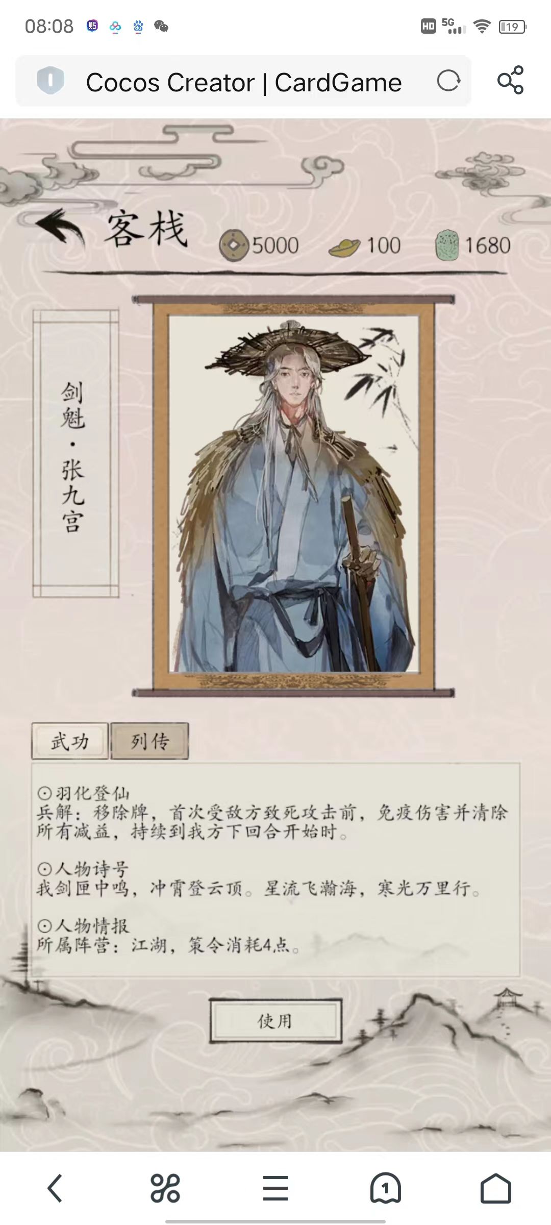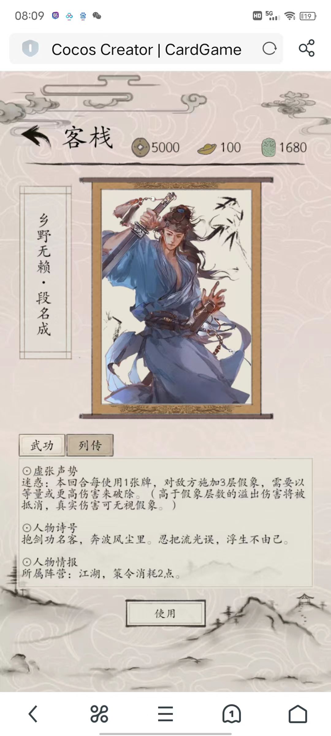 江湖专属0费,可给手牌永久减1费。一般手牌有剑圣优先剑圣防止后面不能及时拿到。优先级:剑圣>马玉枝=张九宫>段名成