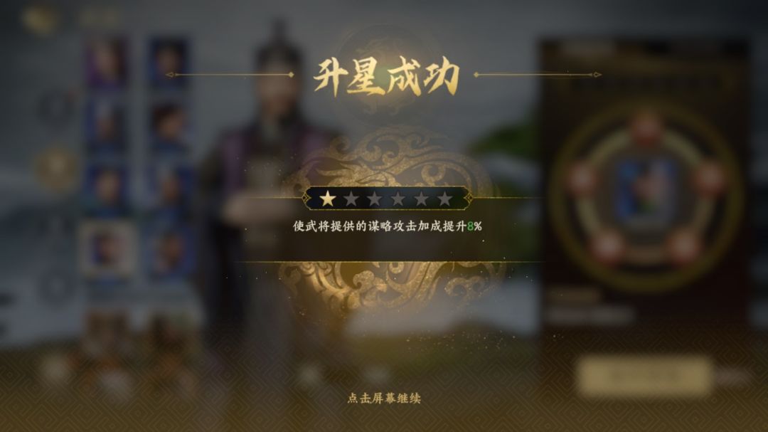 当然,对武将能力提升最大的养成点还要数武将星级。主公们可以通过游戏内的玩法活动获取武将专属信物,消耗信物可提升武将星级。武将星级上限为六星,每个星级之间有五个阶段性节点,每个节点完成后均可获得自由分配的属性点。当五个节点均完成时,武将即升星成功,获得自由分配的属性点的同时还能获得额外的战斗数值增益。其中,增益分为多种,比如增加武将提供的属性数值,强化武将的兵种适性,使武将携带的某类技能带来较大提升。