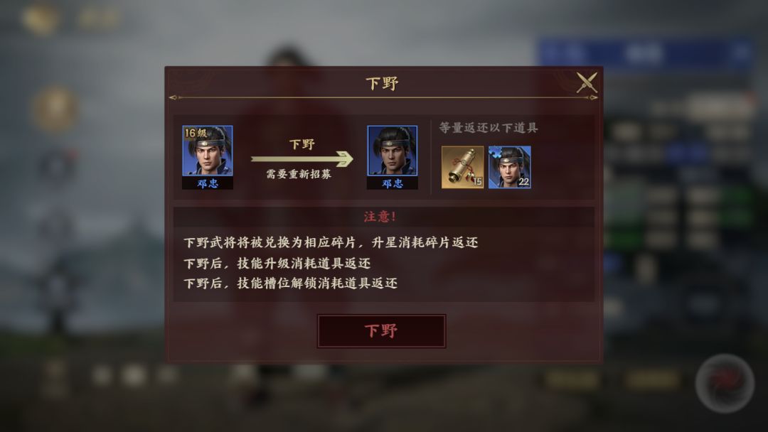 最后,我们还为主公设计了四个贴心的小功能,方便主公们更换武将和编队。首先是武将技能、加点重置功能,主公可随时重置现有技能等级和加点选择,但需要注意重置技能等级无额外消耗,而重置加点情况内则每次需要消耗10名玉。其次是等级互换功能,主公们可以快速互换已有武将的等级和体力,但需要注意转换等级后原有武将的所有养成内容(除星级外)也会被重置,且该功能存在24小时的冷却时间,主公们需要合理使用。而武将重塑功能将会重置武将的星级和技能状态,返还升星和突破所消耗的信物,方便主公调整阵容。当主公需要将已有武将转化为碎片时,可以使用下野功能。武将下野后将会兑换成相应数量的碎片,升星、升级技能、解锁槽位等一系列已消耗的道具也将会返还。如果不慎下野武将,主公们还可以在背包界面合成碎片重新获取武将,方便各位主公随时调用已有武将碎片哦~