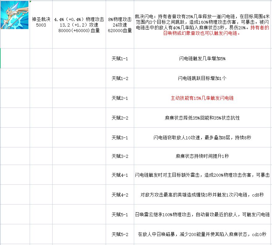 裁决闪电:持有者普攻有25%几率释放一道闪电链,在目标周围4米范围内3个目标之间跳跃,造成160%物理攻击伤害,可暴击。被闪电链击中的敌人有40%几率陷入麻痹状态3秒,易伤20%。持有者的召唤物或幻象普攻也可以触发闪电链。