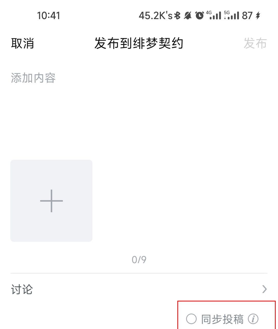 3、点击“+”按钮,并在次级页面勾选“同步投稿”按钮,完成投稿。