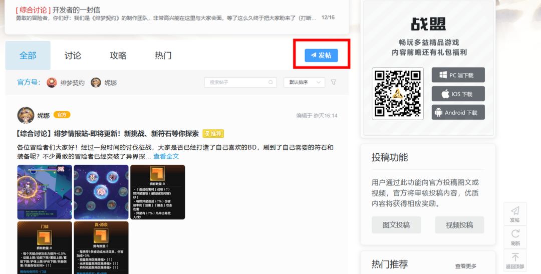 在桌面端“战盟”的《绯梦契约》论坛页面,点击发布按钮,并在次级页面勾选“同步投稿”按钮,完成投稿。下载链接: https://dygame.duoyi.com