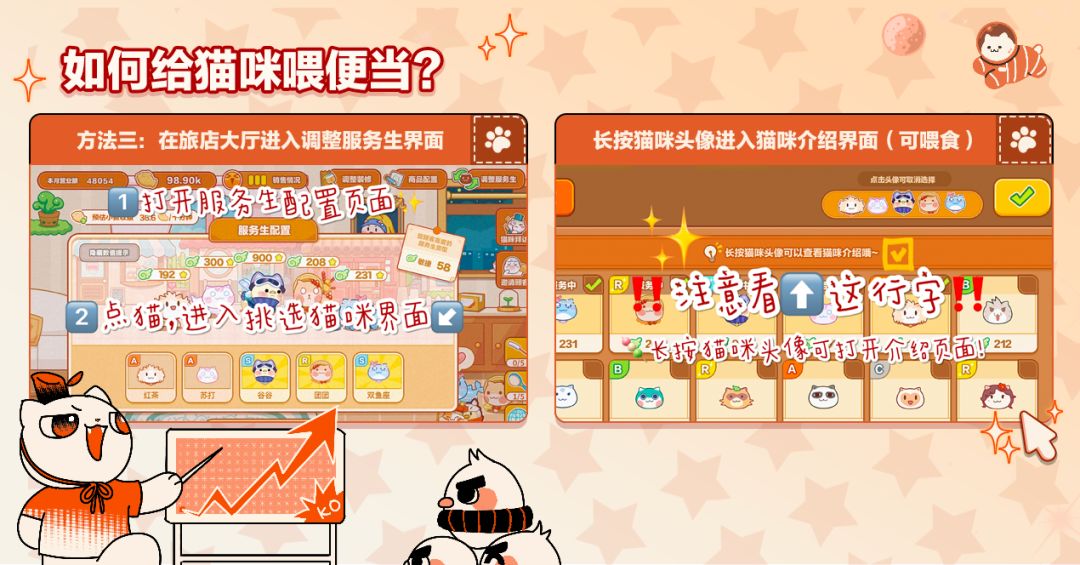 - 方法三:进入猫旅馆大厅→【调整服务生】→打开挑选服务生页面→长按猫咪头像可以查看猫咪介绍→【喂食物】