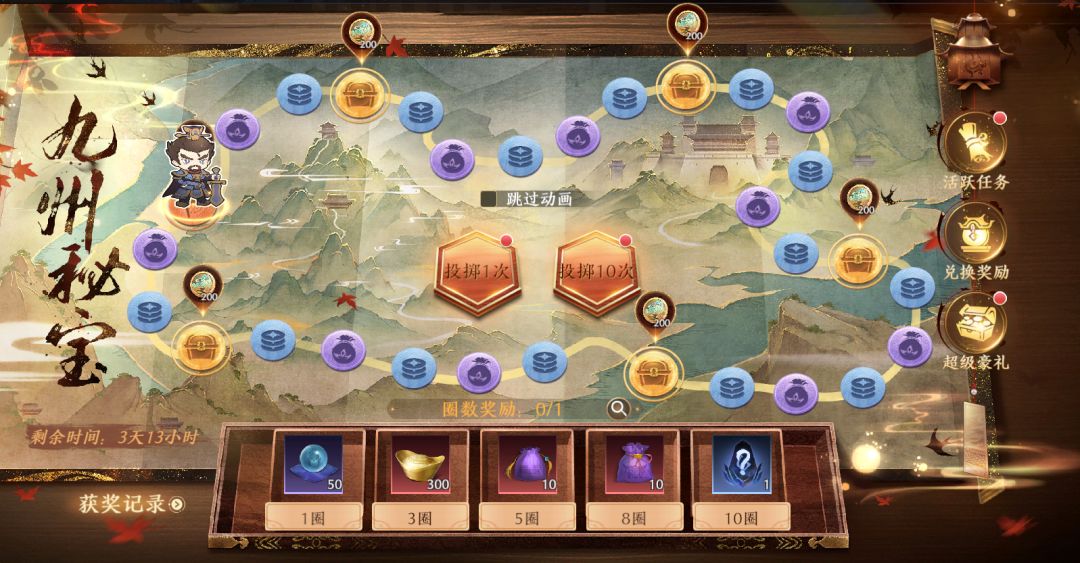 -每移动一次,停留在任意格子都会获得对应的停留奖励,路过显示奖励的高级格子会获得路过奖励,完成特定的圈数会获得圈数奖励。玩家移动到高级格子时,必定获得神兽砚碎片。