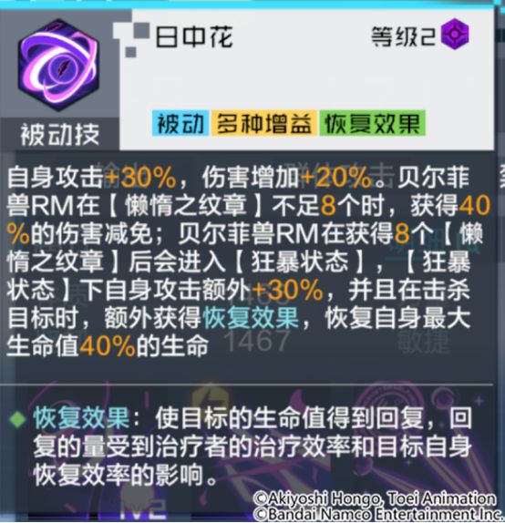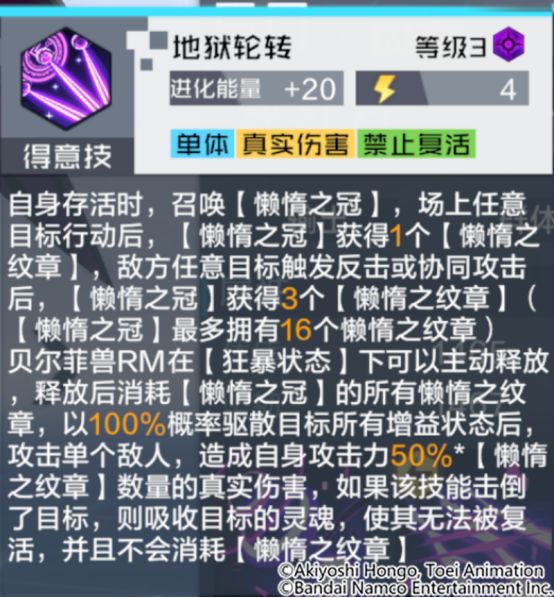 贝尔菲兽RM在【狂暴状态】下可以主动释放,释放后消耗【懒惰之冠】的所有懒惰之纹章,驱散目标所有增益状态后,攻击单个敌人,依据【懒惰之纹章】数量造成真实伤害,如果该技能击倒了目标,则吸收目标的灵魂,使其无法被复活,并且不会消耗【懒惰之纹章】。贝尔菲兽RM的被动技效果是提升自身攻击力与伤害增加。贝尔菲兽RM在【懒惰之纹章】较少时,获得一定的伤害减免;贝尔菲兽RM在【懒惰之纹章】较多时会进入【狂暴状态】,【狂暴状态】下提升自身攻击,并且在击倒目标时,依据自身最大生命值额外获得恢复效果!