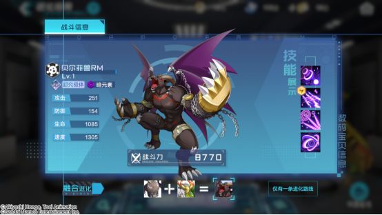贝尔菲兽RM是暗属性数码宝贝中具有强大输出与收割能力的数码宝贝。奥义技是攻击全体目标,造成固定的伤害,由受到攻击的目标均摊,并且会根据目标被附加的减益状态数量来获得最终伤害率加成。得意技是自身存活时会召唤懒惰之冠,场上任意目标行动时懒惰之冠会获得懒惰之纹章,在敌方目标触发反击或协同攻击时,会获得更多的懒惰之纹章,贝尔菲兽RM在狂暴状态下,主动释放得意技会消耗所有的懒惰之纹章,驱散单个目标所有增益状态后,根据消耗的懒惰之纹章数量对目标造成大量的真实伤害,如果该次攻击击倒了目标,则目标无法被复活并且不会消耗懒惰之纹章。被动是进入战斗后提升攻击力和伤害增加,并且根据当前懒惰之纹章数量来获得增益效果,当懒惰之纹章不足一定数量时,自身获得伤害减免,当懒惰之纹章达到一定数量时,自身进入狂暴状态并且获得额外攻击力提升,并且在此状态下,击倒目标时获得额外的恢复效果。