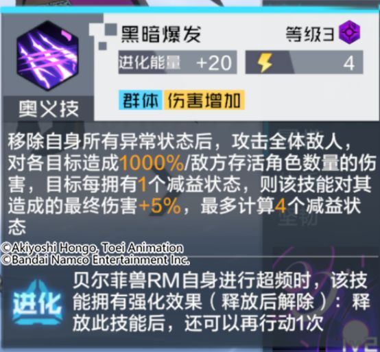 技能解析:攻击单个目标,并且有概率同己方所有的暗属性角色一起发动协同攻击。