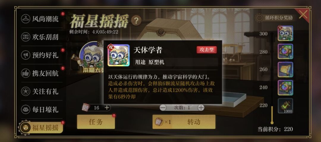 每次摇奖都会获得1点活动积分,累计积分达到指定阶段即可领取循环积分奖励。