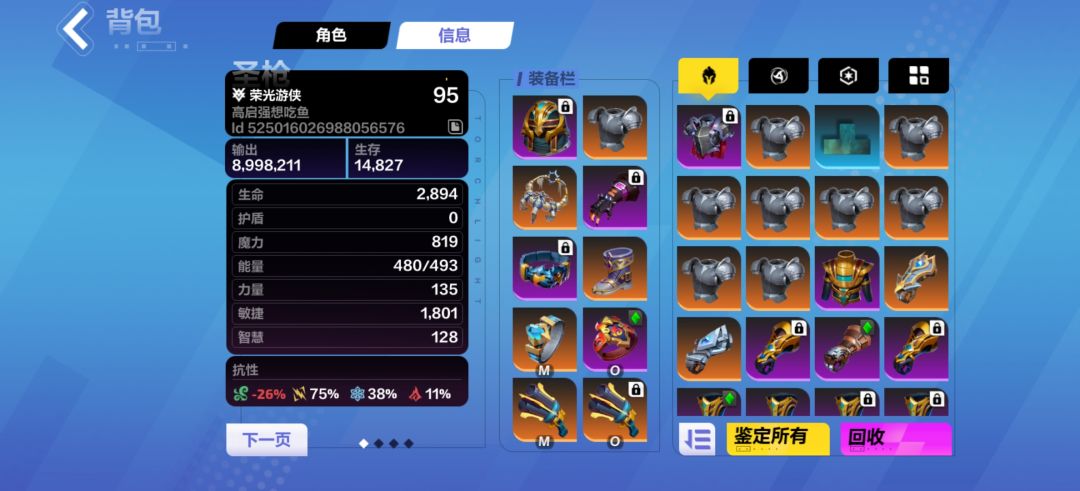 三:装备搭配,这里比较重要,一开始我用紫装自己洗的都是敏捷50-90多的,伤害始终在3亿左右,后来换了几个传奇,效果立马上来了。我这身重要的提升部位是衣服、项链、鞋子,其他比较合适的目前还没有找,大家先凑合一下。
