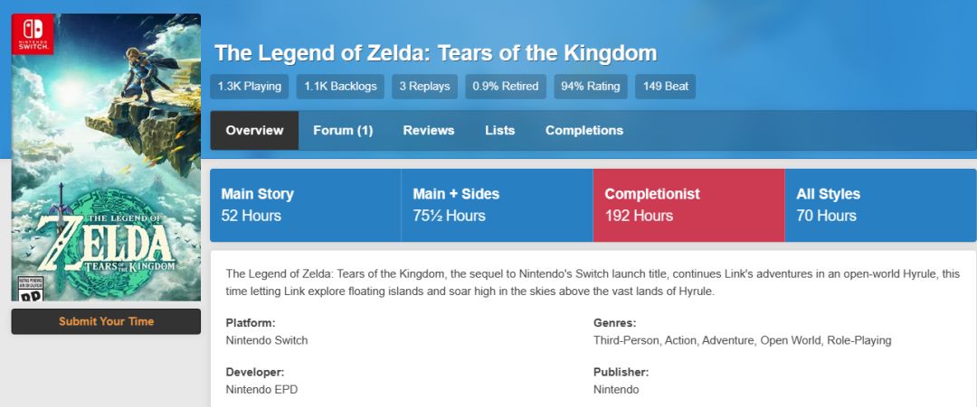 但《王国之泪》不一样,Howlongtobeat网站里大部分玩家的主线通关时间为50小时,主线+支线的通关时间则延长至70小时,而我目前的游戏时间已经奔着100小时去了,且仍有大量内容未能完成。