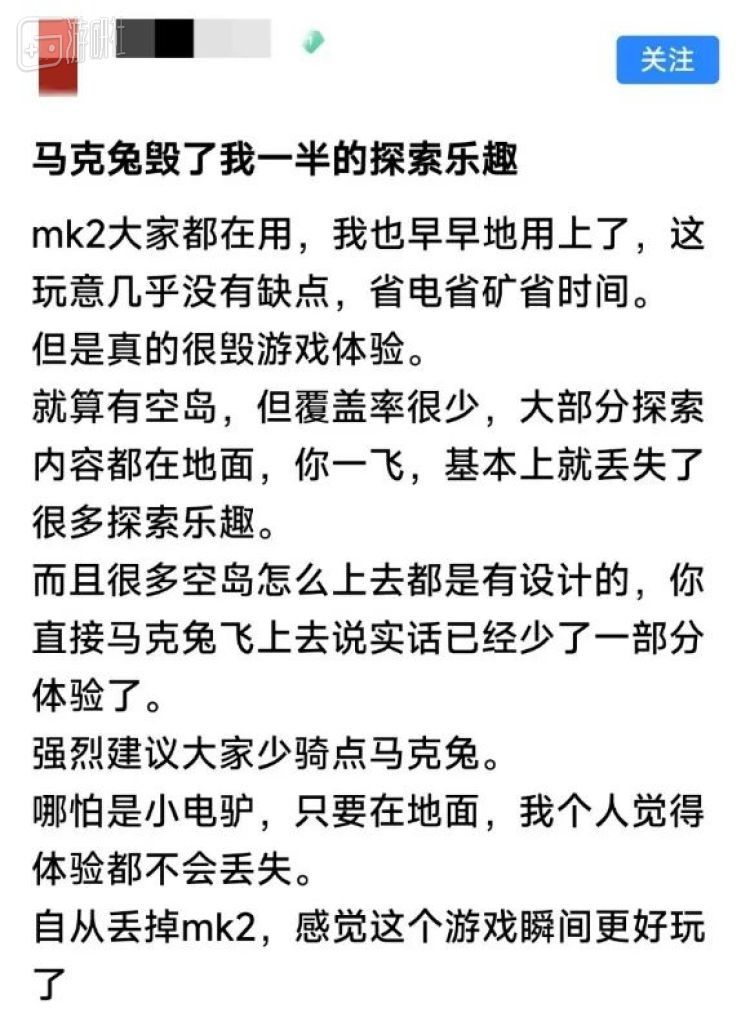 当然,我的蓝图收藏里也有一辆便捷好用的MK2,毕竟地下世界又空又大,何必在这张伸手不见五指的地图里难为自己。然而在某一天,当我在地上世界开着MK2飞向远处的一座神庙时我猛地发现,地表的大量可消费内容与可探索区域都在无形之中被跳过了,“爬上那座高耸的山峰”所带来的成就感变得荡然无存,留给我的是一股工业化机器产出的料理包的味道。