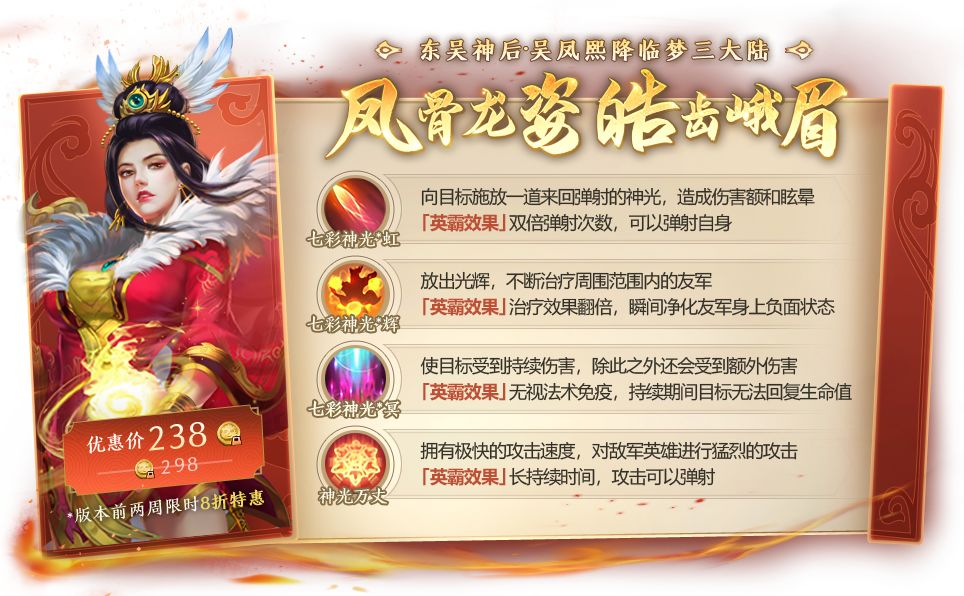 吴凤熙将于6月1日正式降临梦三大陆,版本开启后的前两周将限时八折特惠上架商城,238绑定梦三币购买可获得吴凤熙英雄卡。
