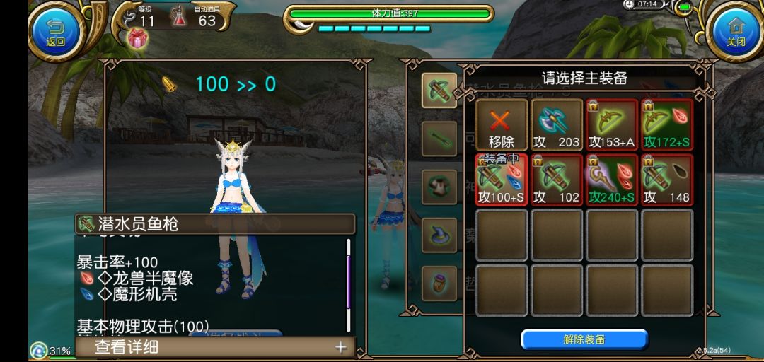 武器:海滩水枪,本次夏活积分兑换,百爆确保了暴击,同时还有魔攻加成,90稳,-100%命中没啥影响。